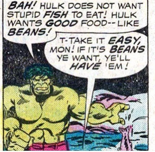 "Bah! Hulk does not want stupid fish to eat! Hulk wants good food – Like Beans!