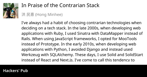The author discusses their preference for choosing unconventional or "underdog" tech stacks, which they playfully term "**contrarian stacks**," as opposed to mainstream or "orthodox stacks." They share past experiences such as using Sinatra over Rails, MooTools over Prototype, and Solid over React. While contrarian stacks may present challenges like limited community support and the need for more self-troubleshooting, they also offer opportunities for deeper understanding and potential contributions to open-source projects. These stacks often emerge as reactions to perceived shortcomings in mainstream technologies, leading to innovative designs. Although assembling a contrarian stack can be complex, it provides valuable insights into the underlying technologies. The author argues that while mainstream stacks may be favored by current LLM trends, the learning opportunities from contrarian stacks remain invaluable, encouraging readers to explore less-traveled paths for unique insights and growth.