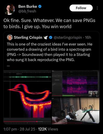 minus-squareSpesknight@lemmy.worldlinkfedilinkarrow-up4·3 months agoX account is called Sterling, talking about a Starling, if you didn’t notice…