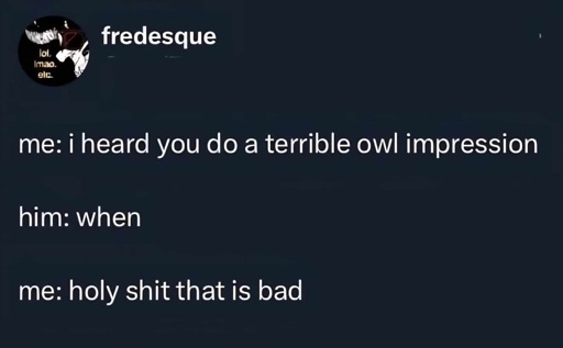 “When did someone tell you that? I’d been working on my owl hoots lately and really improved them.”