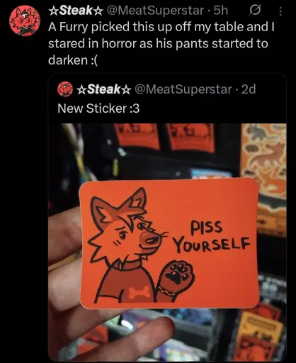 I suppose my question for you is this: If the furry did a controlled leak to freshly wet their pants, with no spillover dripping onto the floor, then went to show their friends what they did for a laugh (the juxtaposition of following the stickers instructions vs the social expectation not to), then proceeded to change into fresh clothes - what’s your objection? Who is being hurt? What’s really ‘not based’ about this obviously juvenile comedic act?