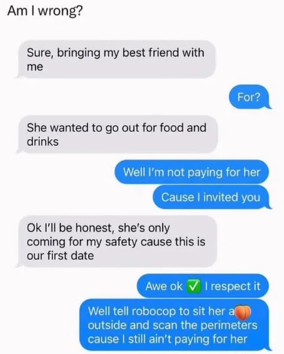 As long as the other person is upfront about it, I wouldn’t be weirded out if they brought a friend to feel better, honestly, no fucking clue who would have an issue with that. Because it’s not about “all men”, it’s about “I’m meeting a stranger”.
