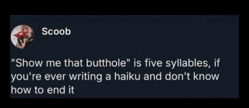 “SHOW ME THAT BUTTHOLE.”I need a linguist to tell me why this one feels strange, but if we switch the first line to