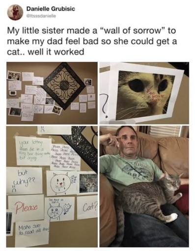 I hate cats. Every year when my neighbor snowbirds for three months I take her two monsters in. At night I would line up about forty empty plastic soda bottles on the table, counter and shelves. Every morning, they were all on the floor. It was our thing. I also like to watch TV on the floor and one of them would always climb onto my chest, nose to nose. Okay, I secretly enjoyed them but I’d never admit that. Never.