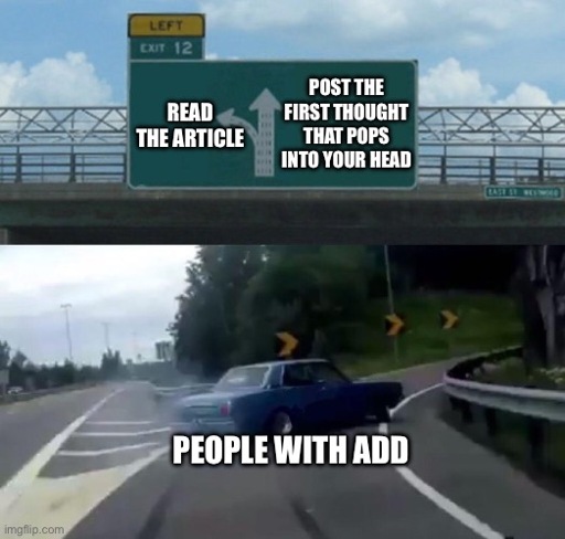 My understanding is that a lot of us on Lemmy have ADD. Perhaps that’s why, for example, it’s not uncommon to see the most upvoted comment in a thread being one that completely ignores what the article actually says, or posts getting downvoted to hell when the article’s headline or initial paragraph appears to present a perspective the community disagrees with, but the overall message is actually more neutral or agreeable.